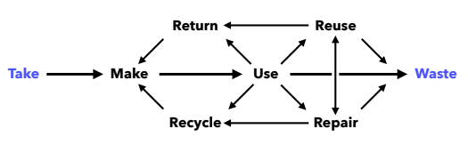 In the linear economy, which is what we have today, organizations take resources from the environment, make products that are distributed for sale, and are usually used for a limited amount of time before they end up as waste.